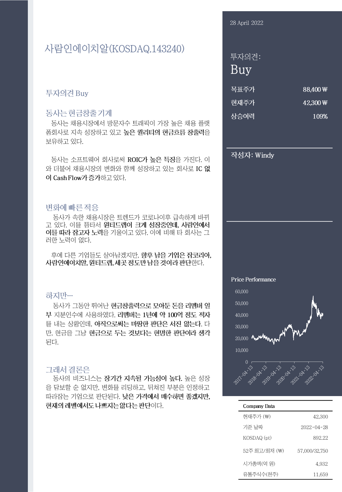 사람인에이치알(KSQ.143240) 분석 - 22.04.28