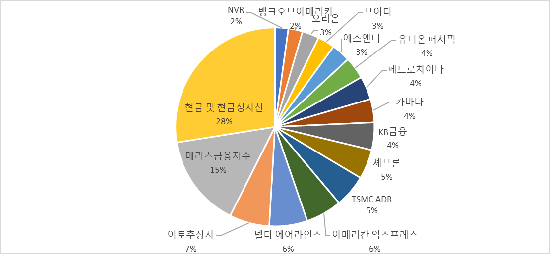 "메리츠금융지주", "카바나" 두 가지 회사에 집중 투자를 했기 때문이라 생각됩니다.