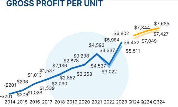 위의 사진은 카바나의 차 한대를 팔때의 이익입니다. 카맥스의 대당판매 이익이 2~3천달러임을 감안하면 거의 두 배의 수치입니다.