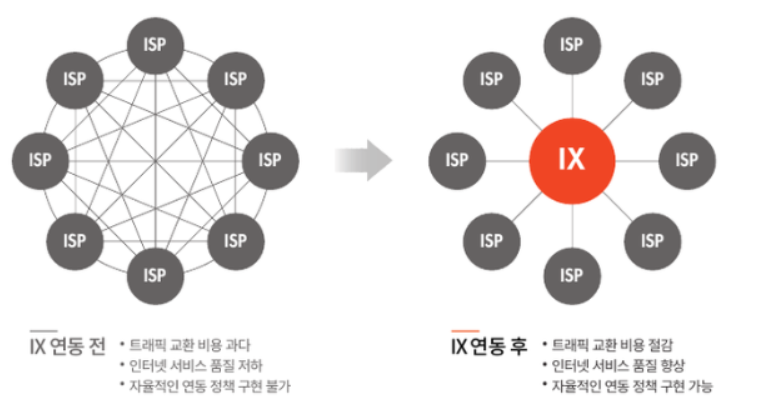 - ISP끼리 Peer to Peer로 망을 연결하면 비효율 증가. IX를 거치면 효율적으로 분배 가능
