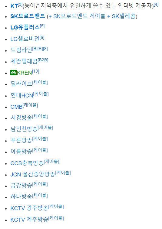 KINX, 세종텔레콤, 온세텔레콤 등 중소사업자 - Back Bone: Tier1 ISP들이 광케이블 등을통해 대형라우터 등을 모아 만든 대역폭이 빠른 핵심 망