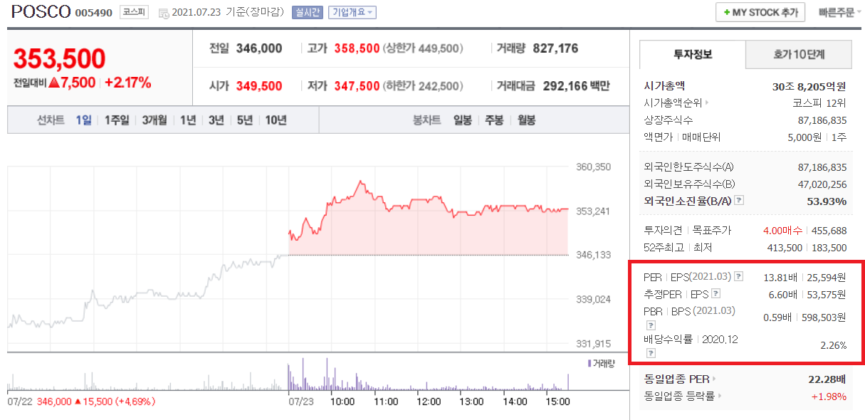 아래는 요즘 아주 핫한 철강섹터의 대표주인 POSCO의 PER 입니다.